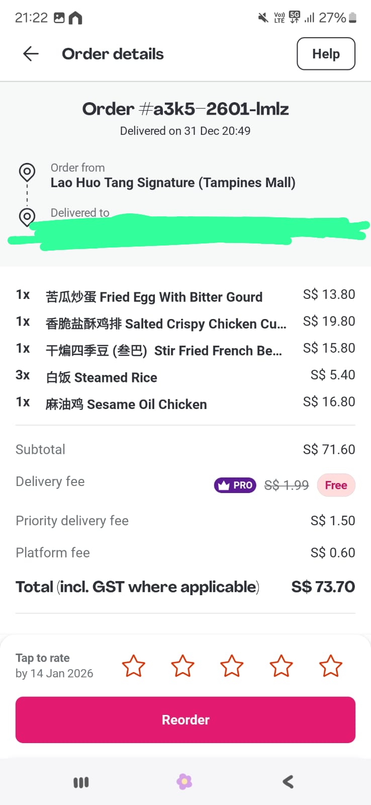 Ordered S$73.70 worth of food, paid extra S$1.50 priority delivery fee